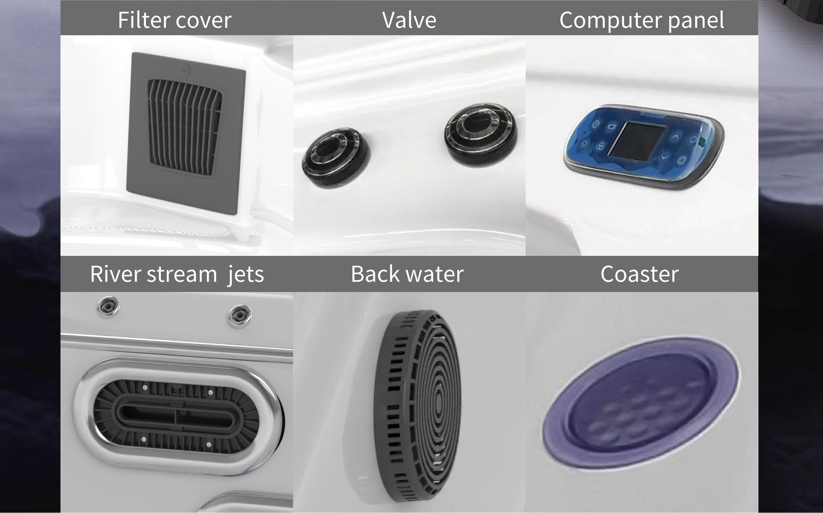 Válvulas de aire y agua : 3 Las válvulas de regulación del aire y 1 válvula de ajuste de agua le brindan un control preciso sobre el flujo de agua y la inyección de aire, personalizando su experiencia de natación.