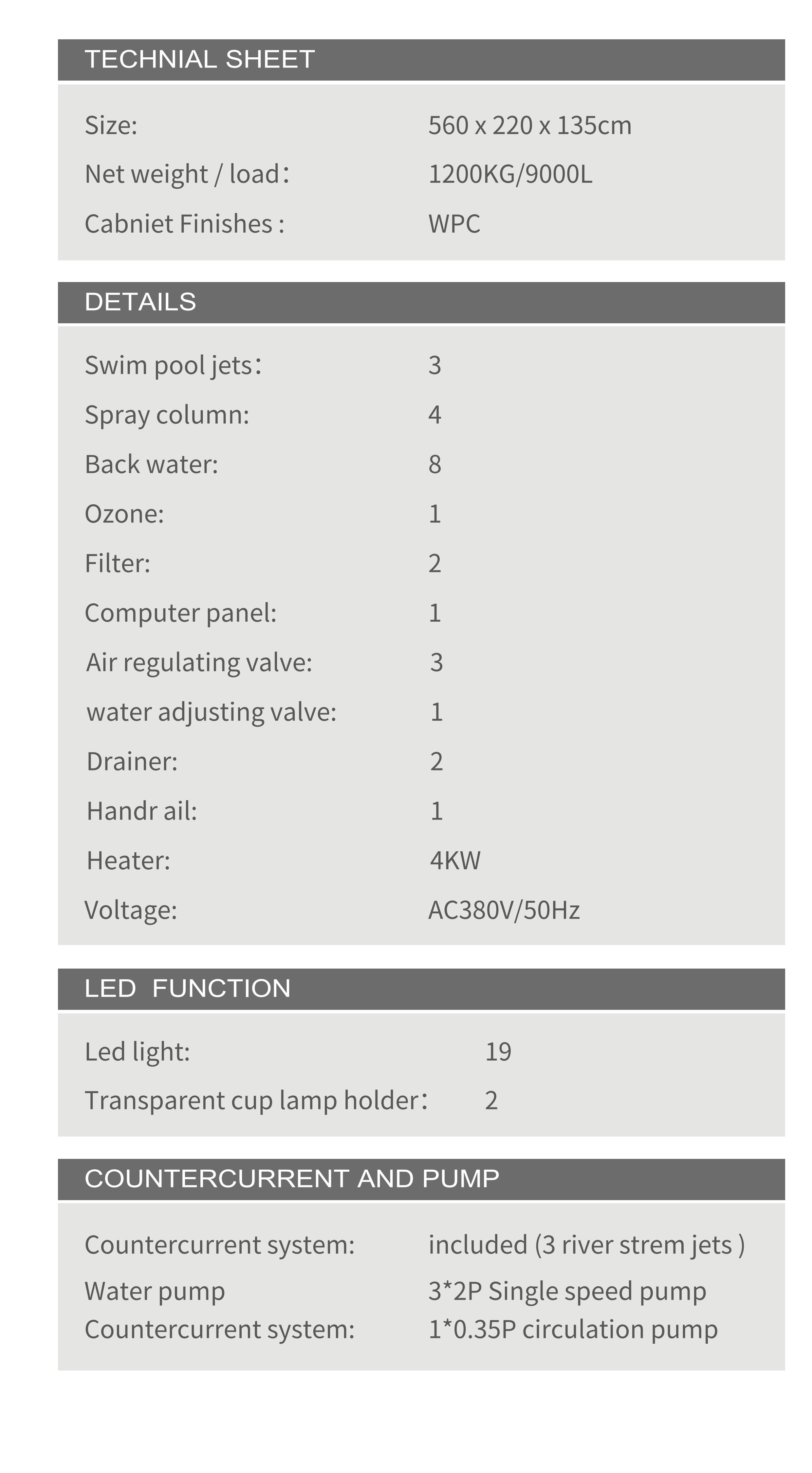 El spa de natación tiene dimensiones externas de 560 cm (longitud) x 220 cm (ancho) x 135 cm (altura), proporcionando un amplio espacio para nadar y descansar. Su peso neto es de 1200 kg, y puede contener hasta 9000 litros de agua, lo que lo hace adecuado para múltiples usuarios al mismo tiempo.