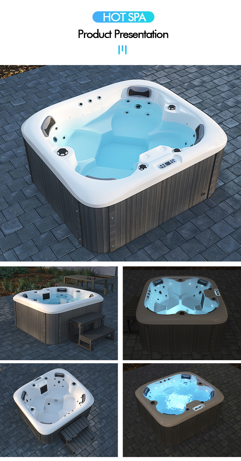 Masaje Balboa System 4 Personas Spa de jacuzzis en el hogar es un equipo de spa de sambor de hidromasaje de masaje de lujo de cuatro personas especialmente diseñado para familias. Utiliza el sistema Balboa avanzado para brindar a los usuarios la mejor experiencia cómoda. Este equipo de spa de baño caliente está equipado con múltiples chorros de masaje que pueden cubrir todas las partes del cuerpo y aliviar efectivamente la fatiga muscular y la tensión. Al mismo tiempo, su sistema constante de control de temperatura asegura que la temperatura del agua siempre se mantenga en el rango más adecuado, lo que le permite sentirse cálido y cómodo mientras disfruta del spa.