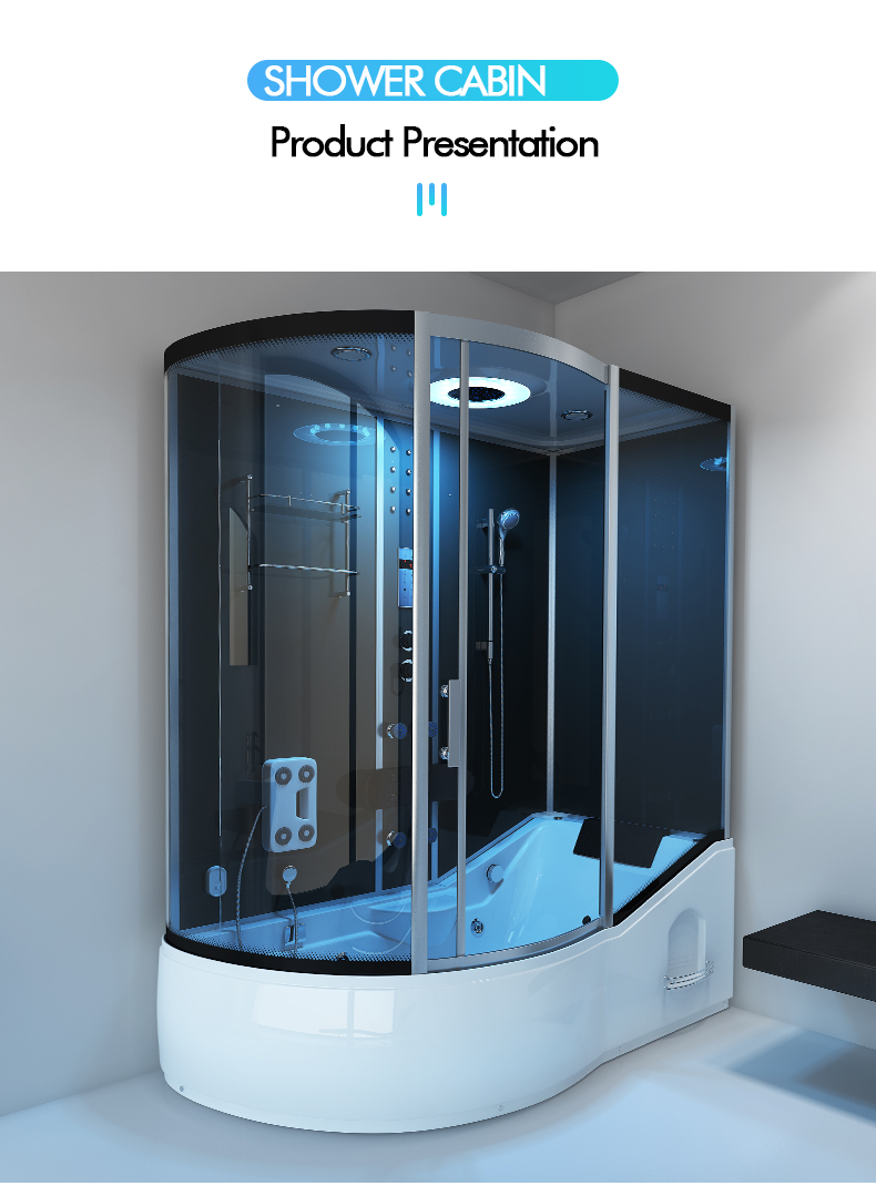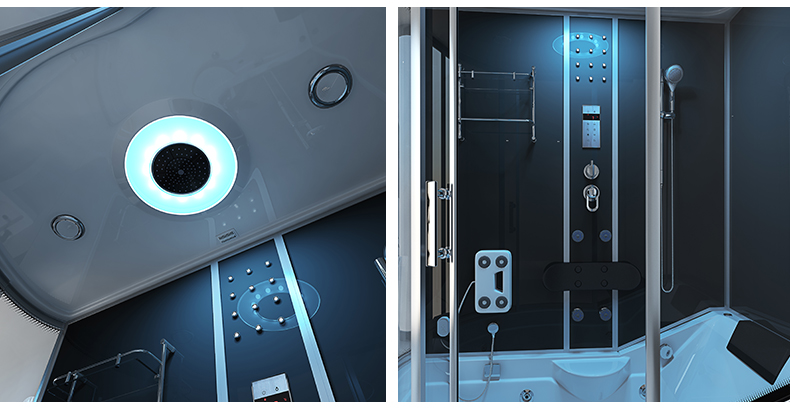 | Lujosa ducha top fija Lujosa lámpara superior Panel de control de computadora Ventilador de ventilación FM Radio y altavoz Teléfono con manos libres Grifo de agua caliente y fría Lámparas de techo y fondo Masaje afilado Estante lujoso Estante de champú y riel de toalla Mango de ducha. Dispositivo de masaje de pies Drenador de hormigas Manejar | Vapor Mezclador termostático |