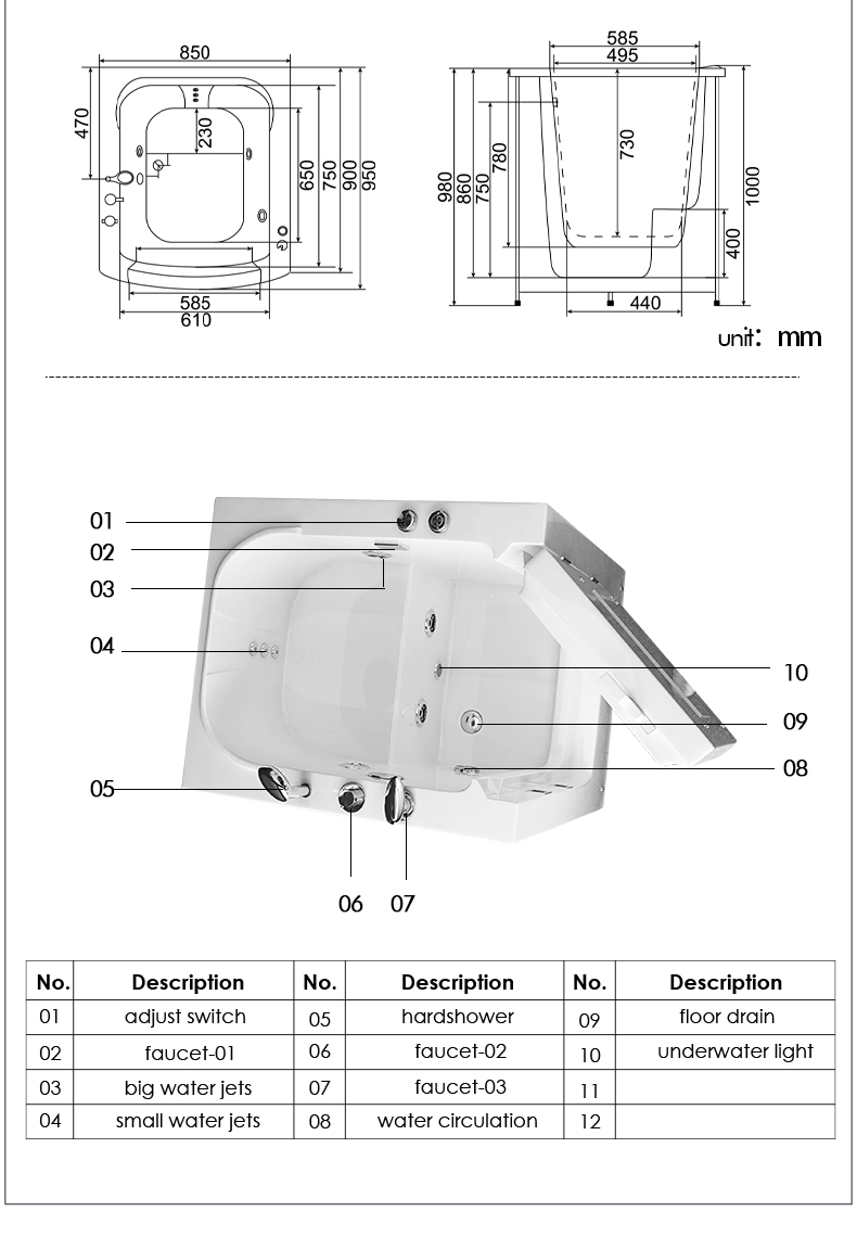 8. Limpieza del dispositivo de masaje hidráulico: llene la bañera con agua caliente (40 ℃), agregue detergente en la proporción de 2g ter, encienda la bomba para el masaje hidráulico durante aproximadamente 5 minutos, apague la bomba y drene el agua, llene la bañera con agua fría, encienda la bomba para obtener el masaje hidráulico durante aproximadamente 3 minutos, apague la bomba, drene el agua y limpie la bañera seca.